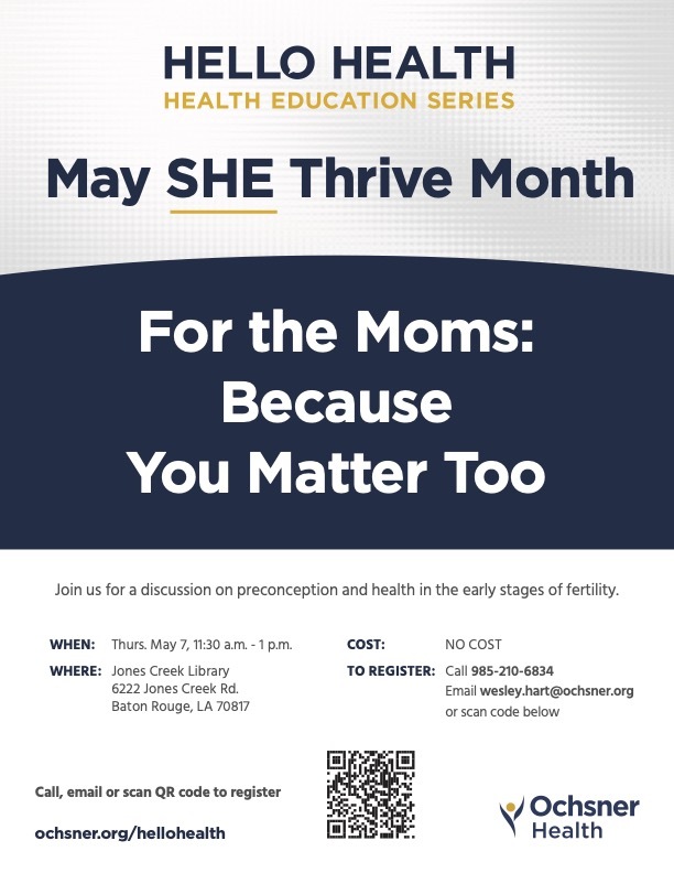 To register, call 985-210-6834 or email wesley.hart@ochsner.org.